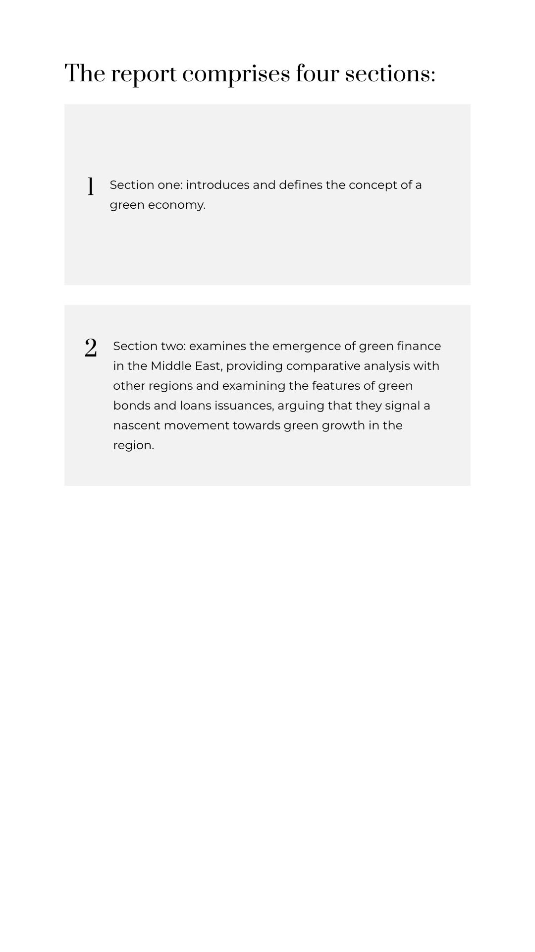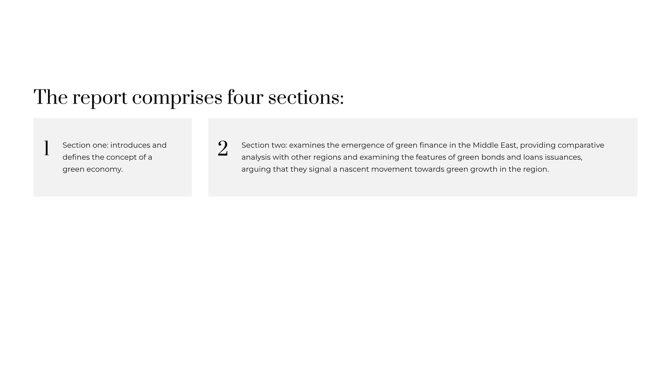 Interest in green investment and financing across the Middle East region is growing in line with global trends. Its success, however, will be dependent on the fostering of an enabling environment; this will be shaped by factors such as national sustainability pledges, finance strategies, reporting standards, financial disclosure of climate risk standards, and standards for sustainable investment products.
