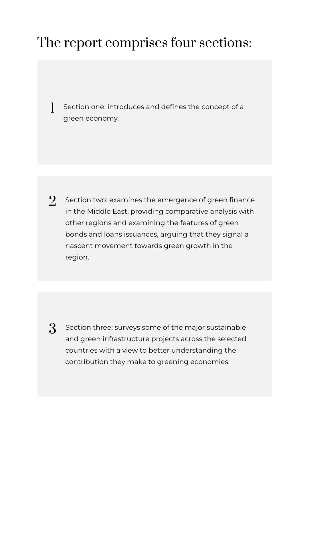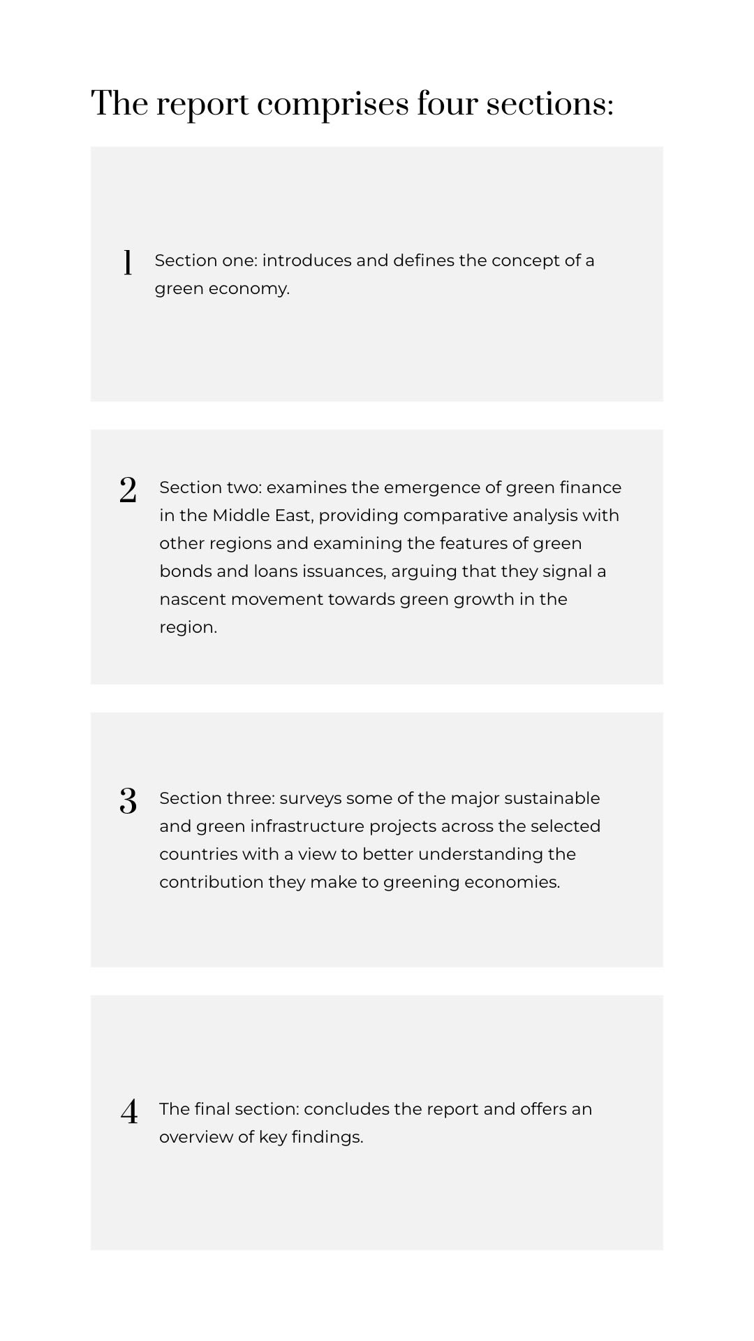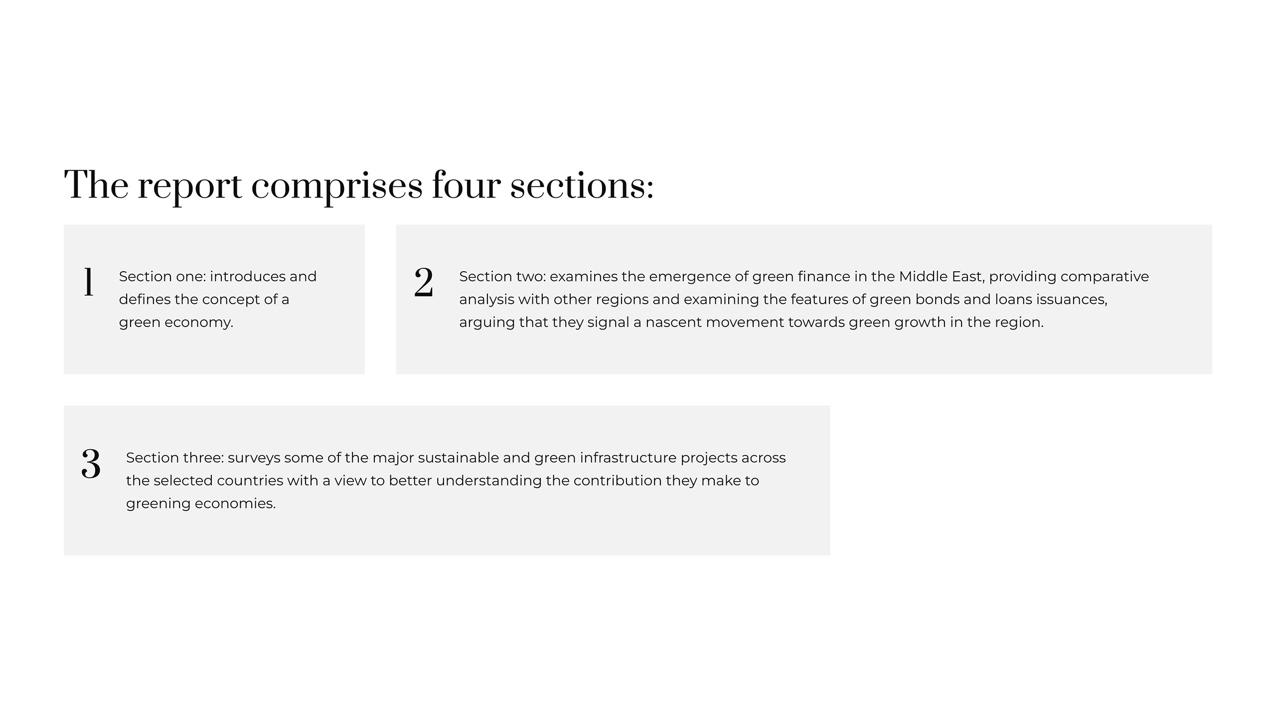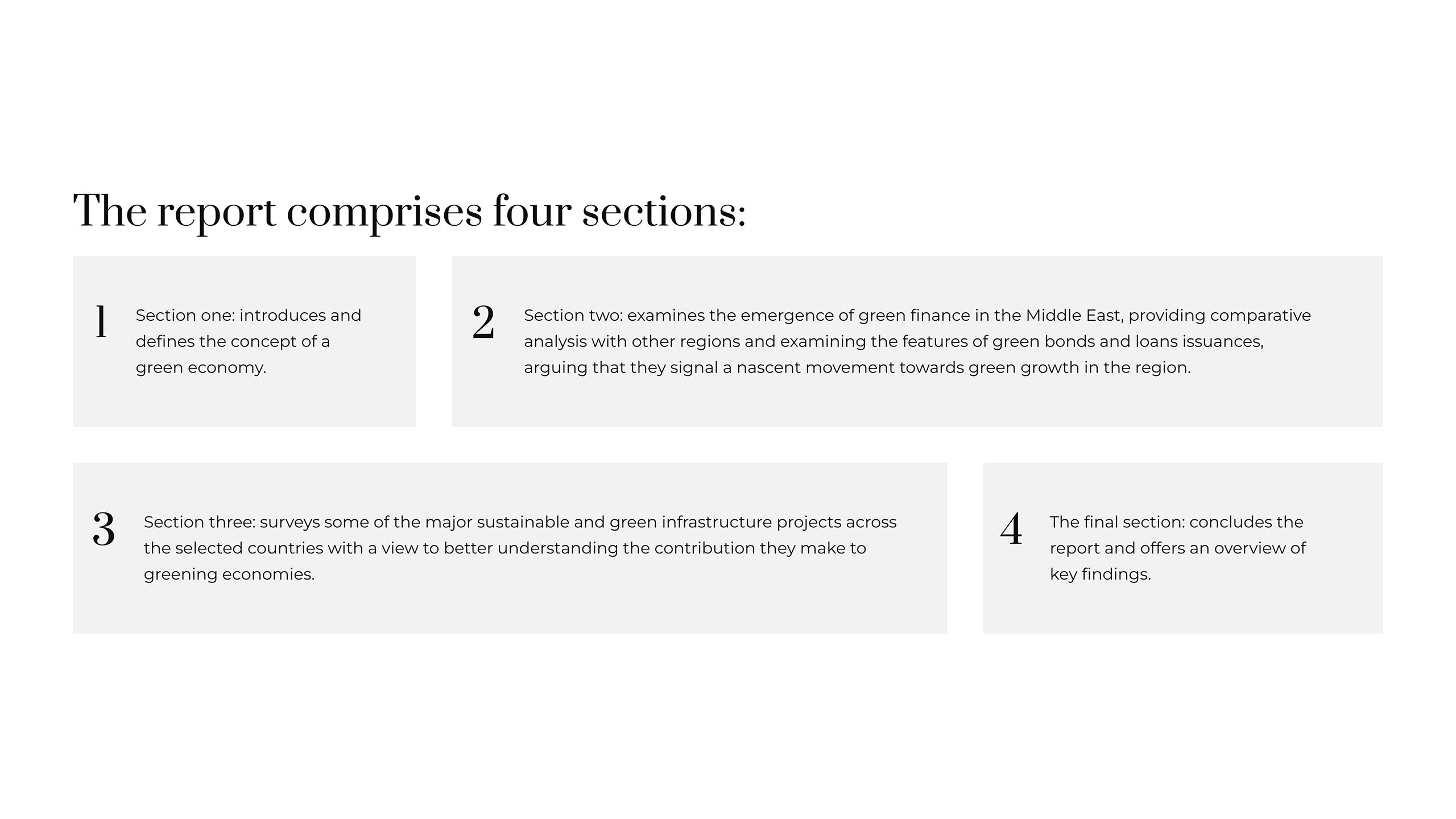 This report provides a snapshot of Gulf Arab states’, Egyptian, Jordanian and Moroccan efforts at greening their economies. This selection of countries has been determined by the availability of data and not deliberate exclusion.